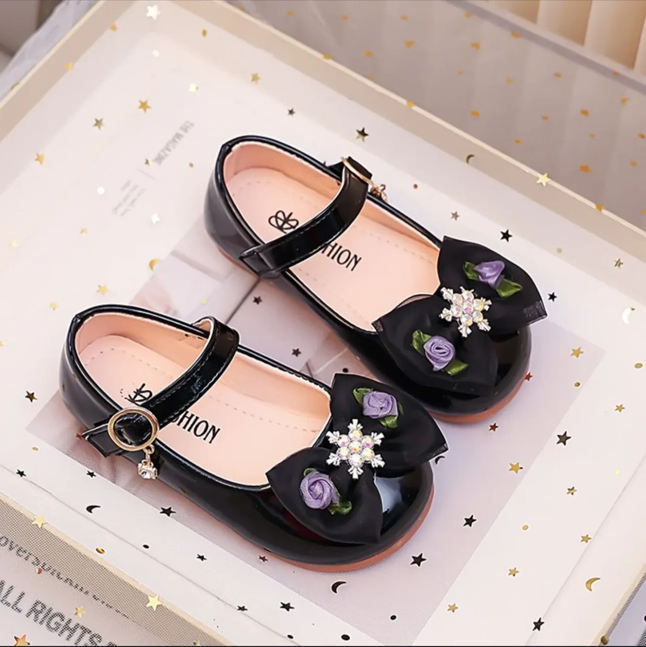 A stylish pair of glossy black girls’ dress shoes featuring a sleek Mary Jane design with a gold-buckled strap. Each shoe is adorned with a large black bow decorated with delicate purple rose appliqués and a sparkling floral crystal embellishment at the center. The soft pink inner lining adds comfort, while the lightweight brown sole completes the elegant look. Perfect for parties, outings, and special occasions.