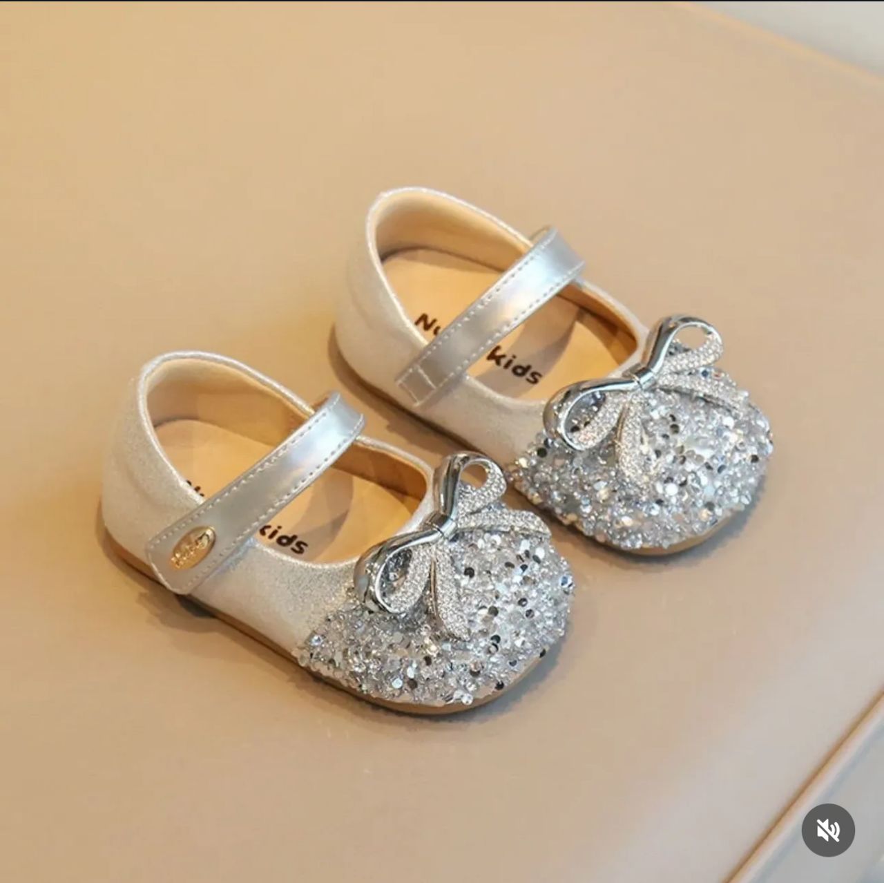 A pair of elegant baby girl shoes featuring a shiny silver strap and a sparkling toe design covered in glittering rhinestones. Each shoe is adorned with a delicate silver bow on the front, giving it a charming and princess-like look. The shoes have a soft inner lining and a light brown sole, perfect for special occasions or stylish everyday wear.